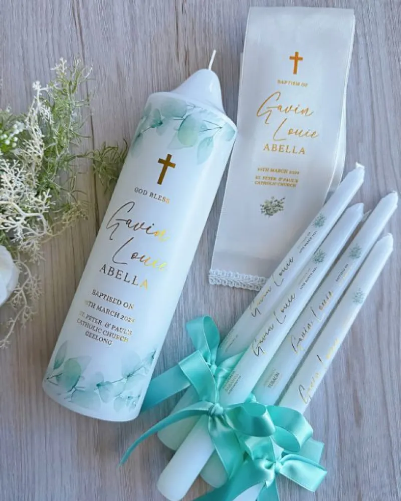 With one main pillar, a stole, and four thin taper candles, this candle set is perfect and beautiful as a keepsake on any ceremonies.
