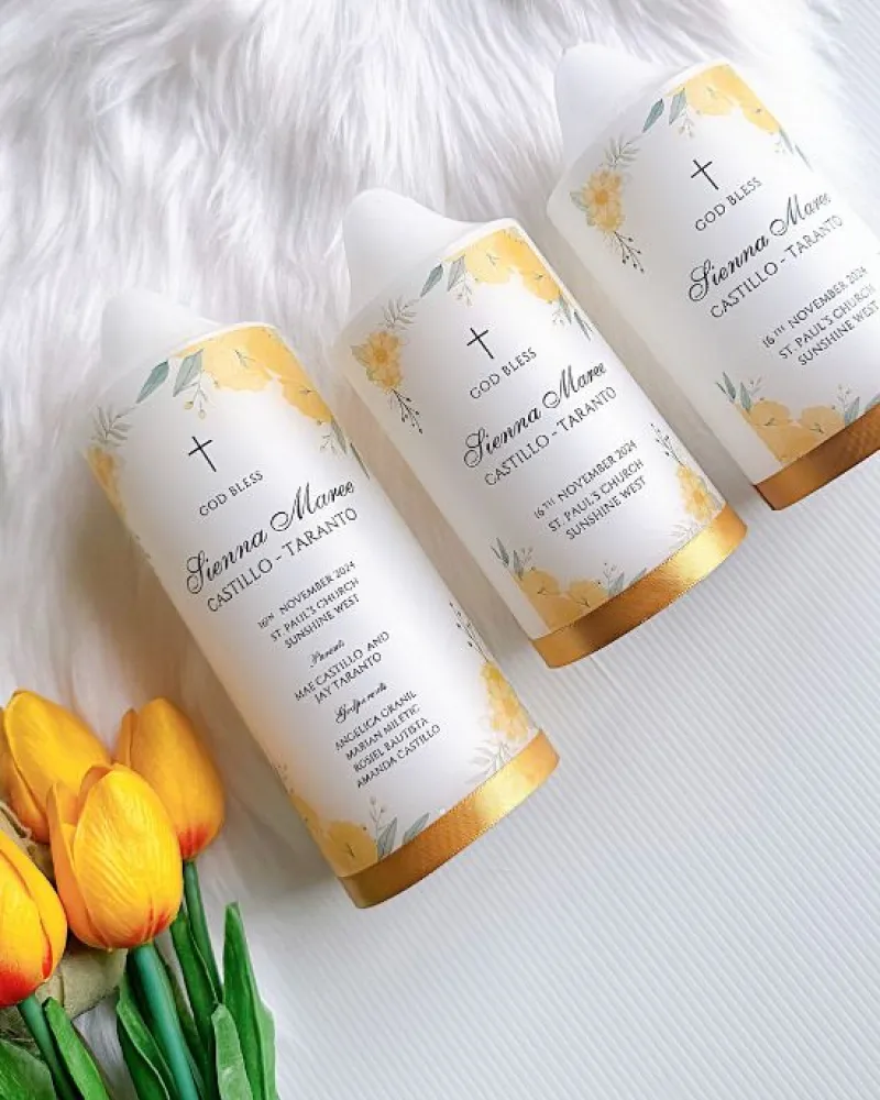 This sunflower yellow design brings a joyful and uplifting touch to any baptism or christening ceremony. Customised with your child’s name, baptism date, church details, and optional message, each candle is thoughtfully designed to reflect your family’s special moment.